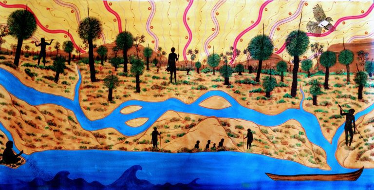 ‘Three Brothers’ artwork by Marcus Ferguson depicting the Nyangbal people’s settlement of Ballina, Coraki and Woodburn in NSW.