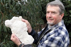 CREDIT: ABC. Tony Healy holds a cast of a Yowie footprint, Woodenbong.